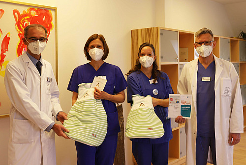 Beschreibung: Das Team der Klinik für Frauenheilkunde und Geburtshilfe, v.l. Professor Wolfgang Janni, Ärztlicher Direktor, die Hebammen Susanne Lehr und Almut Knauß und Sektionsleiter Professor Frank Reister, übergibt künftig allen Eltern bei
