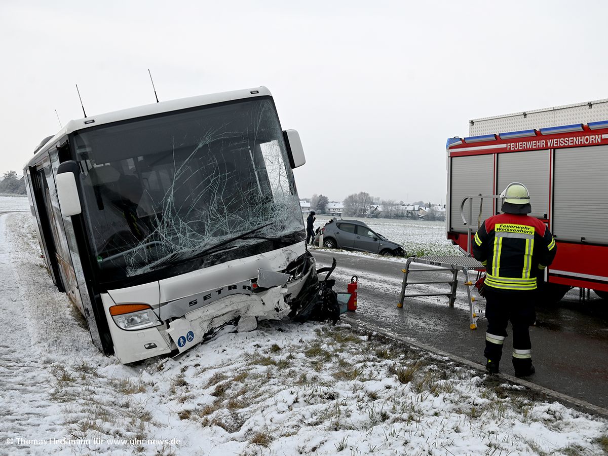 Am Montagmorgen, gegen 07.15 Uhr, fuhr eine 19-jährige Frau mit ihrem Pkw auf der Staatsstraße 2022 von Oberhausen in Richtung Weißenhorn. Auf freier Strecke, etwa zwei Kilometer vor dem Ortseingang Weißenhorn, kam die junge Frau bei winterlichen Straßen- und Wetterverhältnissen mit ihrem Pkw in einer Linkskurve ins Schleudern und prallte mit der Fahrerseite gegen die vordere linke Front eine entgegenkommenden Linienbusses. Die 19-Jährige wurde durch den Aufprall so schwer verletzt, dass sie noch an der Unfallstelle verstarb.