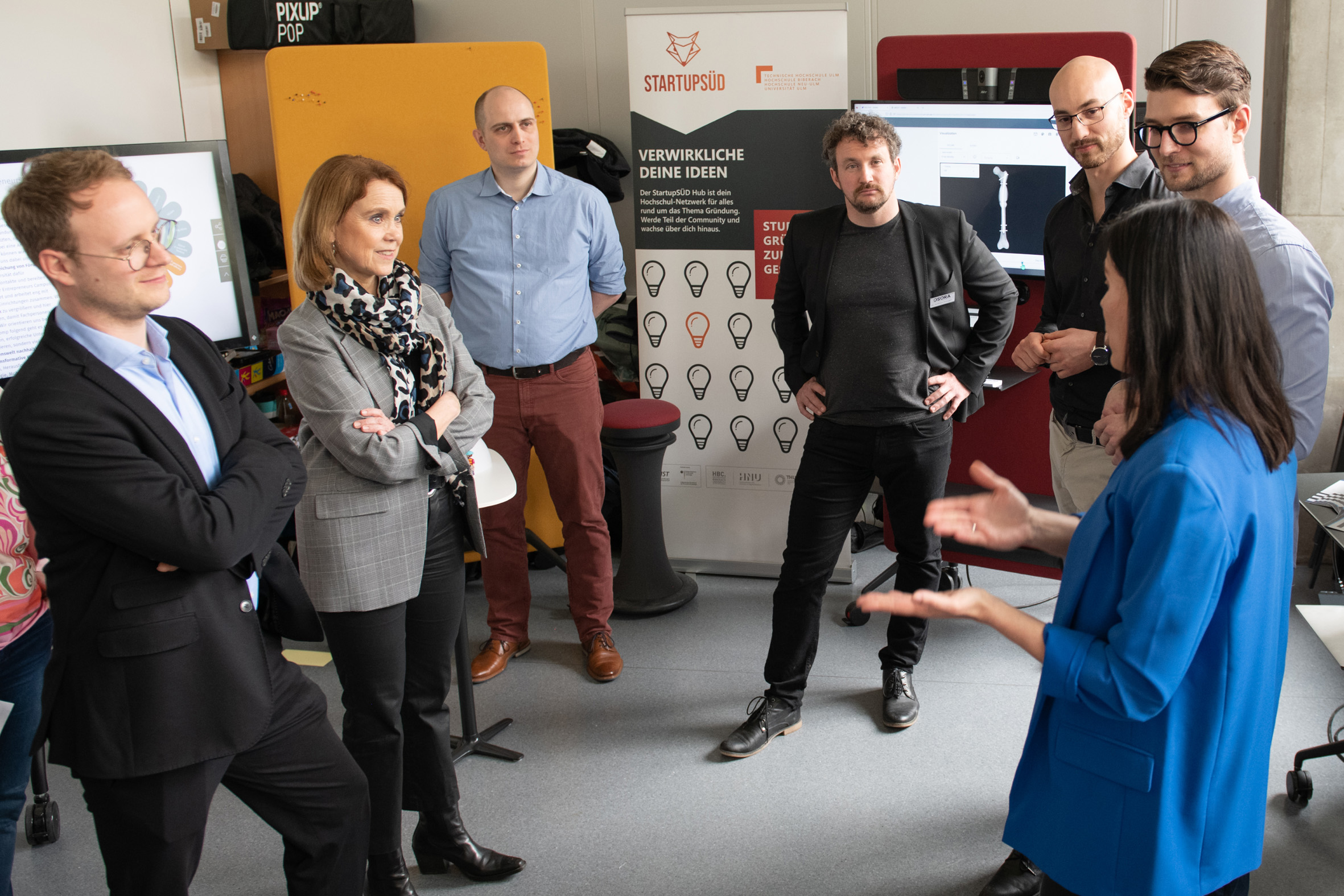 Beschreibung: Wissenschaftsministerin Petra Olschowski im Gespräch mit Birgit Stelzer (rechts), Geschäftsführerin des Entrepreneurs Campus, und Gründern.