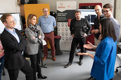 Erster Halt der Ministerin war der Entrepreneurs Space, wo Roboter Pepper Künstliche Intelligenz erklärte. Das Konzept des Entrepreneurs Space: Gründungswillige coachen und so zum Transfer wissenschaftlicher Erkenntnisse in die Wirtschaft beitragen. Verschiedene Fachrichtungen sollen sich durch Begegnungen miteinander vernetzen und Lösungen für gesellschaftliche Herausforderungen entwickeln.