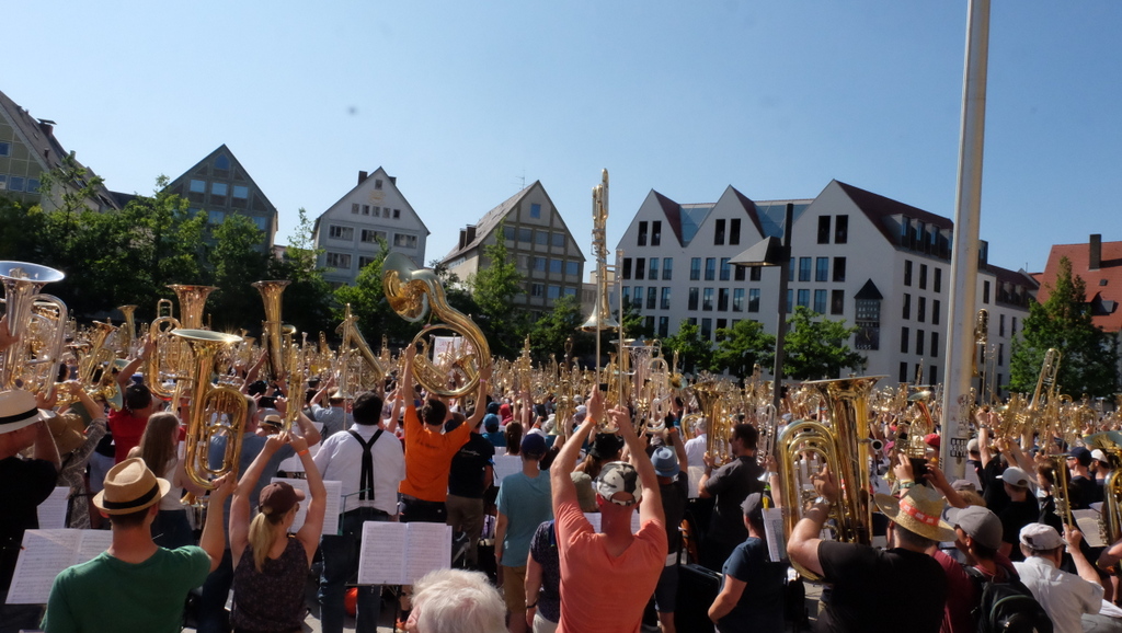 Höhepunkt war aber wie in den Jahren zuvor die Schlussfeier am Sonntagnachmittag auf dem Münsterplatz. Die über 7500 Blechbläserinnen und Blechbläser bildeten einen mächtigen, beeindruckenden Klangkörper. Das Konzert des riesigen Blasorchesters mit mehreren tausend Musikern vor der mächtige Kulisse des Ulmer Münsters war ein großartiges Gemeinschaftserlebnis für die Blechbläser und für die Zuhörer ebenso ein Erlebnis mit Gänsehautatmosphäre. Besonders beim Abschlusslied  "Gloria sei dir gesungen", das in die Klänge des Ulmer Münstergeläut überging. Eindrucksvoll auch der Dank an Gott und nach oben, indem alle Musikerinnen und Musiker ihre Instrmente in die Höhe streckten.