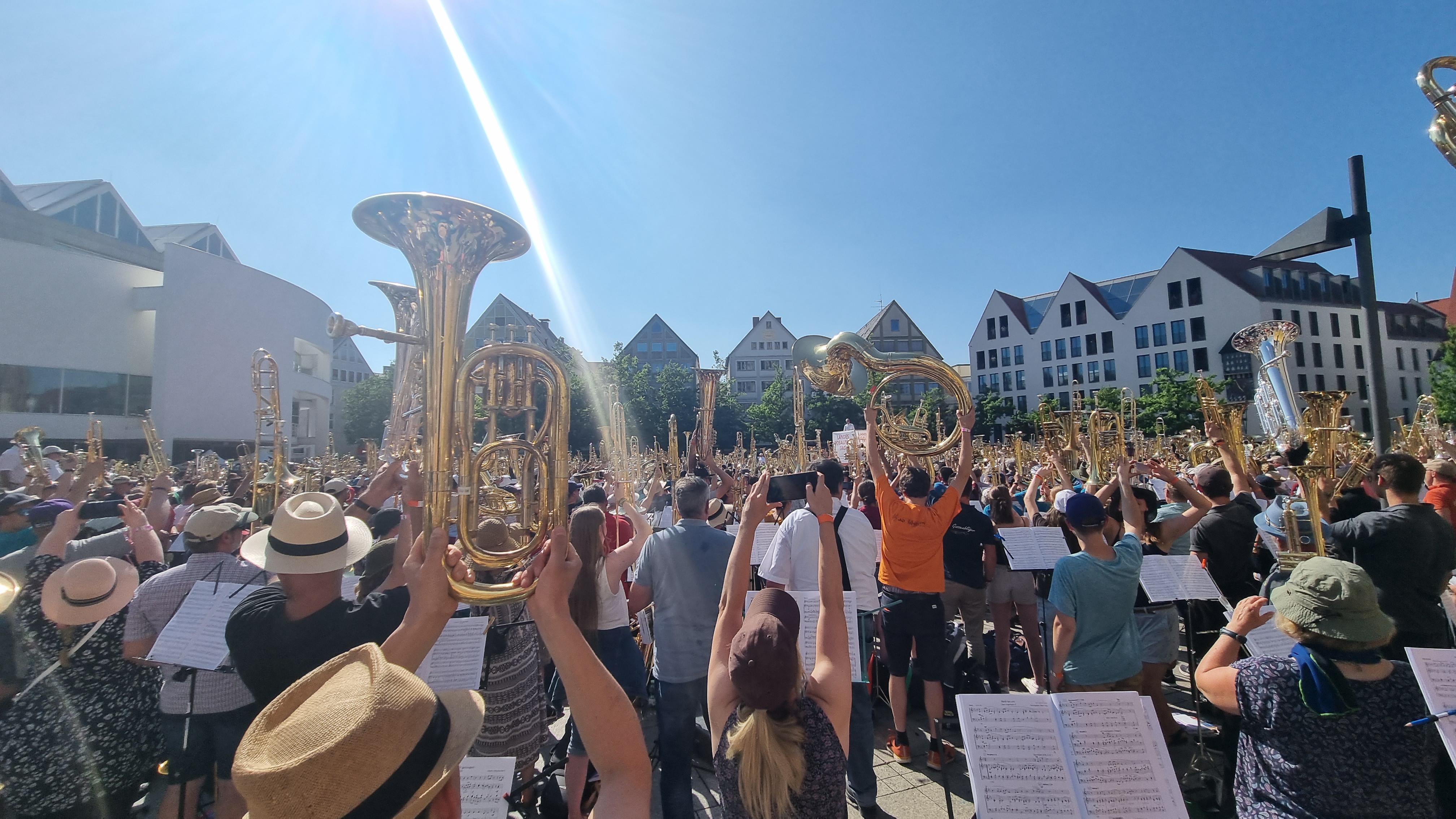 Höhepunkt war aber wie in den Jahren zuvor die Schlussfeier am Sonntagnachmittag auf dem Münsterplatz. Die über 7500 Blechbläserinnen und Blechbläser bildeten einen mächtigen, beeindruckenden Klangkörper. Das Konzert des riesigen Blasorchesters mit mehreren tausend Musikern vor der mächtige Kulisse des Ulmer Münsters war ein großartiges Gemeinschaftserlebnis für die Blechbläser und für die Zuhörer ebenso ein Erlebnis mit Gänsehautatmosphäre. Besonders beim Abschlusslied "Gloria sei dir gesungen", das in die Klänge des Ulmer Münstergeläut überging. Eindrucksvoll auch der Dank an Gott und nach oben, indem alle Musikerinnen und Musiker ihre Instrmente in die Höhe streckten.