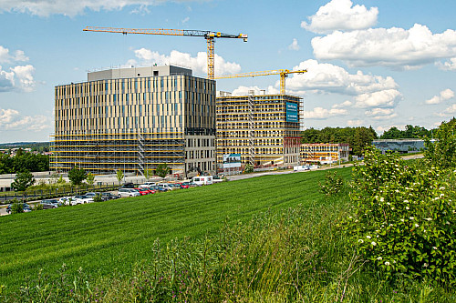 Beschreibung: Die Arbeiten an UNIVERSELLE ULM, einem neuen achtgeschossigen Bürokomplex der Ulmer Wissenschaftsstadt, gehen planmäßig voran.