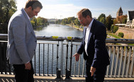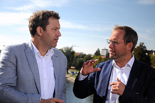 Treffpunkt Grenzlinie. Der Ulmer SPD-Kreis- und Fraktionsvorsitzende Martin Ansbacher und der SPD-Parteivorsitzende Lars Klingbeil spazierten am Freitag von der Herdbrücke aus über den Markplatz zum Ulmer Münster. Dort wurden die beiden von Münsterdekan Dr. Torsten Krannich und der Münsterbaumeisterin Dr. Heidi Vormann zu einer kurzen Führung durch das Gotteshaus empfangen. Martin Ansbacher sagte: „Ich freue mich sehr, dass sich Lars Klingbeil trotz vollen Terminkalenders Zeit für mich und Ulm genommen hat und ich mit ihm über bundespolitische Unterstützung bei kommunalpolitischen Themen wie Wohnungsbau, Klimaschutz oder öffentlicher Nahverkehr sprechen konnte.“