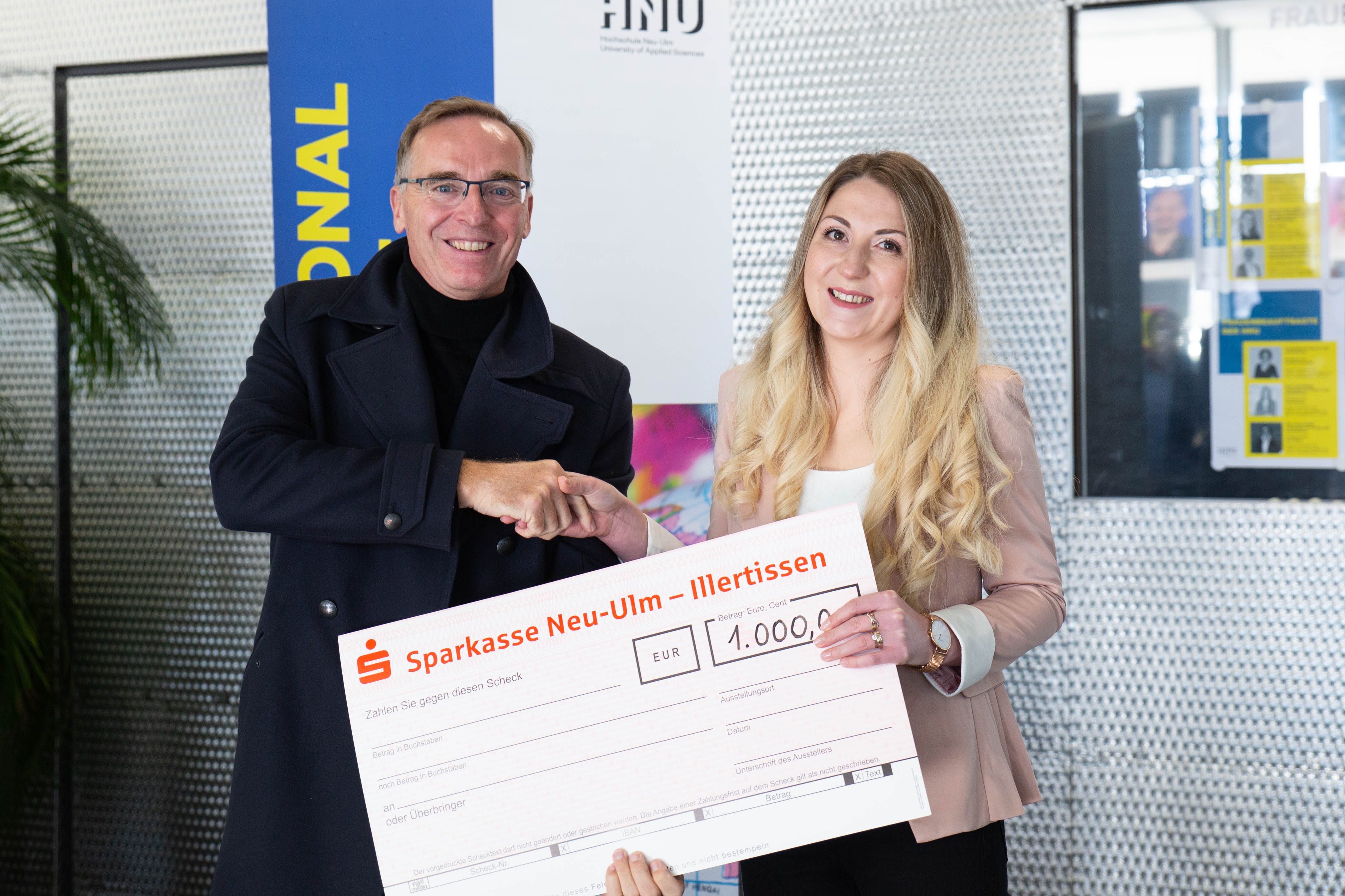 Beschreibung: Sadika Madzharova, Vollzeitstudentin im Bachelorstudiengang Informationsmanagement und Unternehmenskommunikation an der Hochschule Neu-Ulm (HNU), wurde für ihre akademischen Leistungen und ihr Engagement an der HNU mit dem DAAD-Preis ausgezeichnet.