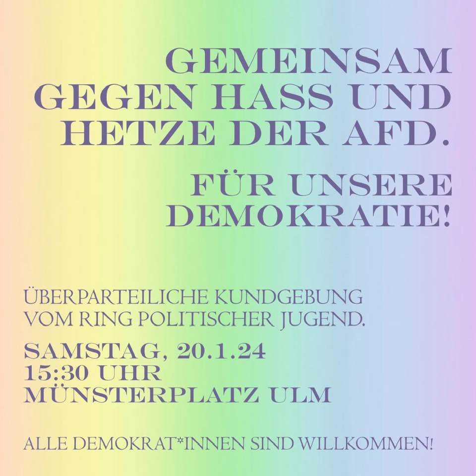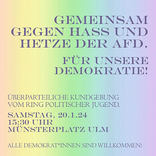Der Ring politischer Jugend Ulm (RPJ) ruft zu einer überparteilichen Kundgebung unter dem Motto „Gemeinsam gegen Hass und Hetze der AfD. Für unsere Demokratie!“ auf. Die Veranstaltung findet diesen Samstag, 20. Januar, ab 15.30 Uhr auf dem Münsterplatz in Ulm statt.