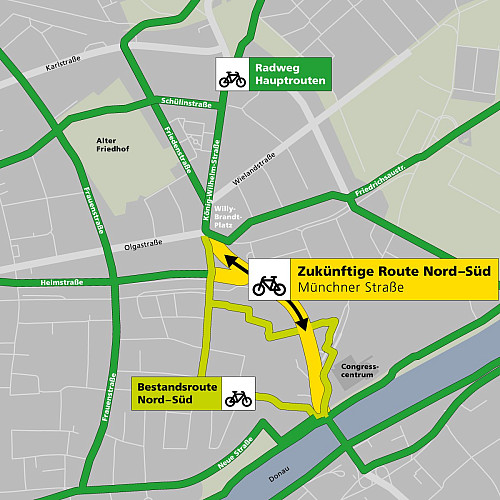 Beschreibung: Die bisher vierspurige Münchner Straße in Ulm, die den Willy-Brandt-Platz mit der Gänstorbrücke verbindet, bekommt ab Anfang März in beiden Richtungen Fahrradstreifen.