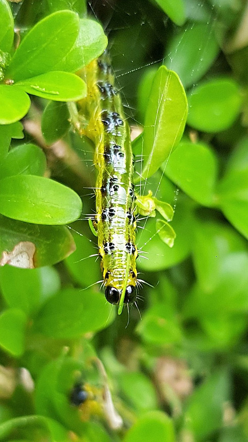 Beschreibung: Pflanzenteile, die vom Buchsbaumzünsler befallen sind, gehören in den Restmüll und dürfen nicht als Grüngut entsorgt werden.