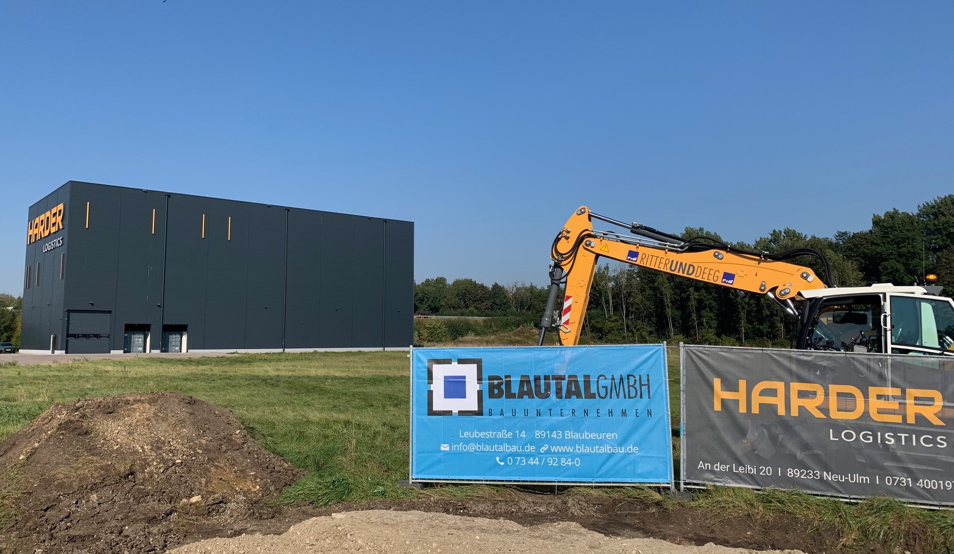 Nur 14 Tage nach Erteilung der Baugenehmigung beginnt HARDER logistics mit den geplanten Erweiterungsbauten im Gewerbegebiet Riffelbank. Als Generalunternehmer ist das beauftragte Blautal Bauunternehmen aus Blaubeuren bereits auf der Baustelle aktiv.