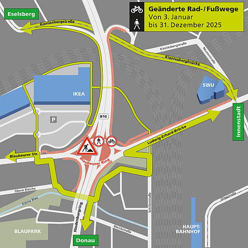 Nun legt die Arbeitsgemeinschaft richtig los: Noch vor Weihnachten werden Teile der Baustelleneinrichtung dorthin gebracht. Bereits heute werden die Info-Stelen mit Übersichtsgrafiken zur Orientierung für die Radfahrer*innen und Fußgänger*innen rund um das Blaubeurer Tor aufgestellt.