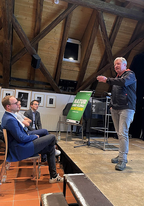 Den genannten Frust wandelte er in seinem Vortrag daher in einen leidenschaftlichen Appell um: Im Gegensatz zur Wettervorhersage, bei der selbst er sich einmal vertun könne, sei die Sache mit dem Klimawandel eindeutig - und die Konsequenzen, die man ziehen müsse, daher auch. Als Maßnahme nannte der leidenschaftliche Radfahrer unter anderem das Tempolimit, das eine unbestreitbar sinnvolle Maßnahme sei: "Wir sind eines von wenigen Ländern auf der Welt, die kein Tempolimit auf Autobahnen haben. Und die anderen haben teils gar keine Autobahnen!" Ein Zuruf, den die rund 100 Zuschauenden im Pfleghof mit kräftigem Applaus empfingen. Fast schon schade fand es Roth, vor gut informierten und klimabewegten Menschen zu sprechen und nicht die zu erreichen, die dem Thema zu wenig Bedeutung beimessen.