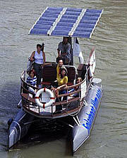 Daneben waren aber auch noch weitere Aufgaben zu lösen wie z.B. die Vereinbarung von Zielen und der Aufbau einer effizienten Organisation: "Wir wollen, dass sich die Champions- League nicht allein auf Basis der in der Tabelle aufgeführten Zahlen entscheidet", erklärt Solarthemen-Herausgeber und Mitinitiator der europäischen Wettbewerbs, Andreas Witt: "Die zusammen mit den europäischen Partnern entwickelten Kriterien sollen das gesamte Engagement im Energiebereich in den Kommunen dokumentieren." Ziel des Wettbewerbes ist auch die Förderung der Nutzung von erneuerbaren Energien, der Vergleich mit anderen Städten in Europa,die Veröffentlichung ihrer Projekte und Vorgehensweisen auf nationaler und europäischer Ebene und der gegenseitige Wissensaustausch aller Teilnehmer über gute Projekte und Strategien. Im Bild die Solarfähre auf der Donau (Foto: Stadt Ulm)